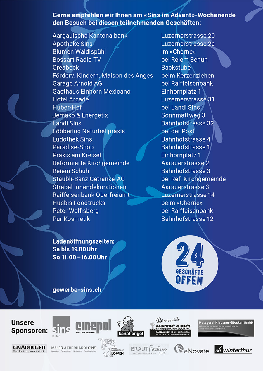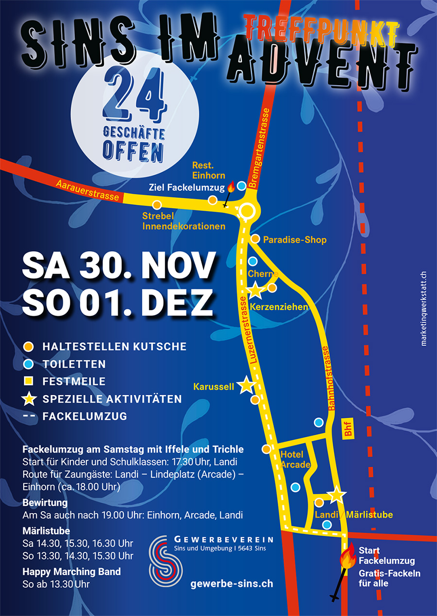 ATTRAKTIONEN IM DORF: Sa 14−19 Uhr | So 11–16 Uhr LADENÖFFNUNGSZEITEN: Sa bis 19 Uhr | So 11−16 Uhr TOLLE ADVENTSSTIMMUNG: Kerzenziehen, Kutschenfahrten, Samichlaus, Karussell, Musik, Märlistube, Fackelumzug u.v.m. Bewirtung: (Sa auch nach 19 Uhr) Einhorn, Arcade, Landi