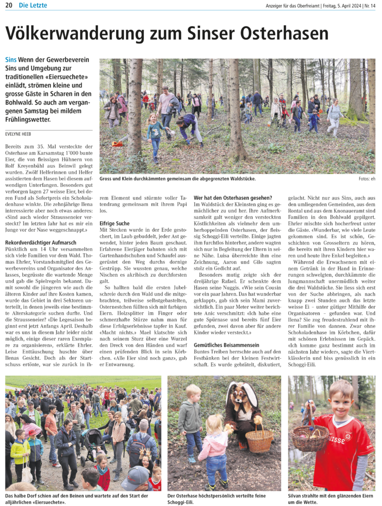 Sins, 05. April 2024 – Wenn der Gewerbeverein Sins und Umgebung zur traditionellen «Eiersuechete» einlädt, strömen kleine und grosse Gäste in Scharen in den Bohlwald. So auch am vergangenen Samstag bei mildem Frühlingswetter.