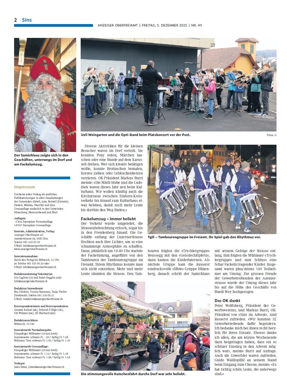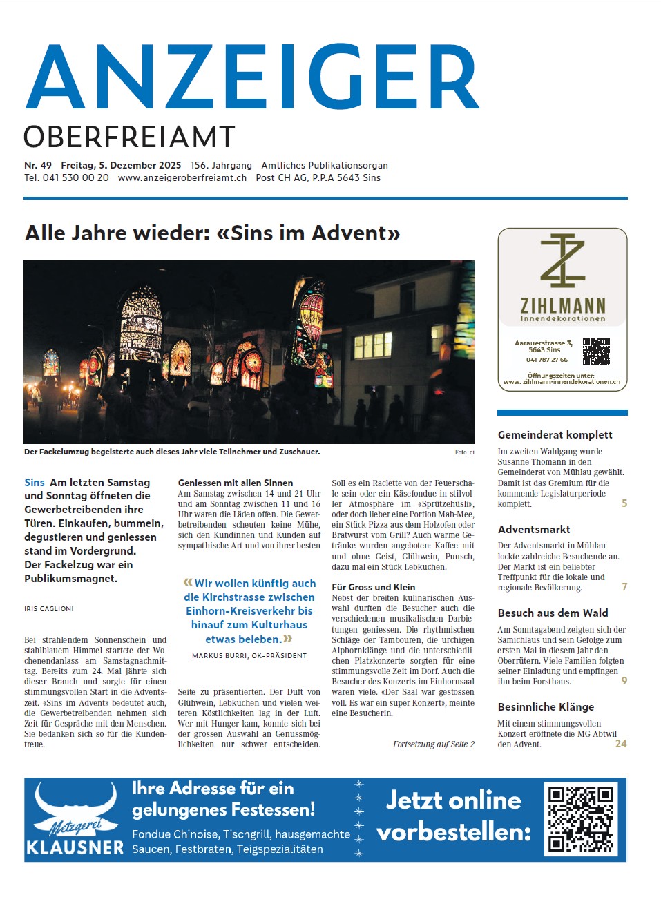 Alle Jahre wieder: «Sins im Advent» Geschrieben am 5. Dezember 2025. Sins, 5. Dezember 2025 – Am letzten Samstag und Sonntag öffneten die Gewerbetreibenden ihre Türen. Einkaufen, bummeln, degustieren und geniessen stand im Vordergrund. Der Fackelumzug war ein Publikumsmagnet. Zurück