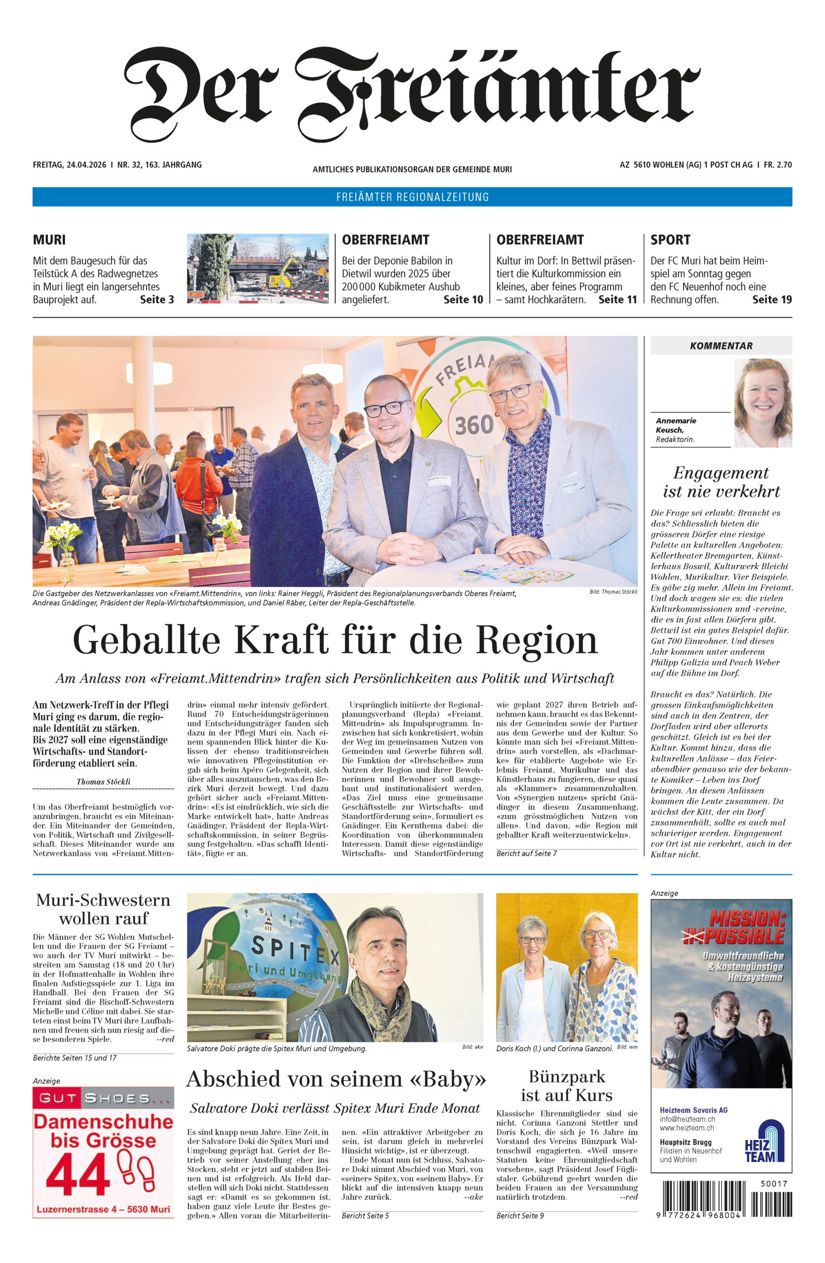 Am vergangenen Mittwoch wurden alle Gold-, Silber- und Bronzepartner sowie die Gründungs-, Medien-, Freizeit- und Kulturpartner zum ersten Partneranlass 2026 eingeladen. Unter dem Motto «Gemeinsam für eine starke Region FREIAMT.MITTENDRIN.» fand der Anlass in den beeindruckenden Räumlichkeiten der pflegimuri statt, im ehemaligen Benediktinerkloster. Der Gewerbeverein Sins und Umgebung gehört zu den Gründungspartnern von «FREIAMT.MITTENDRIN.» und war vertreten durch den Präsidenten Martin Niederberger und Vizepräsident Andreas Gnädinger sowie weitere Mitglieder des Gewerbevereins Sins und Umgebung.